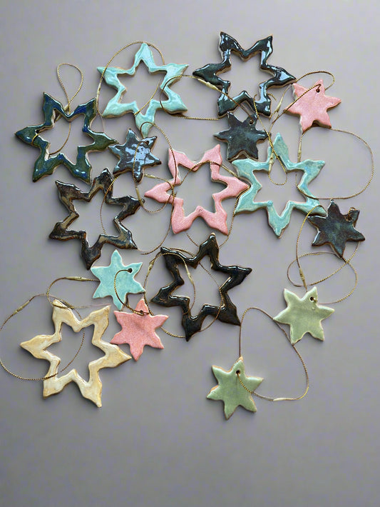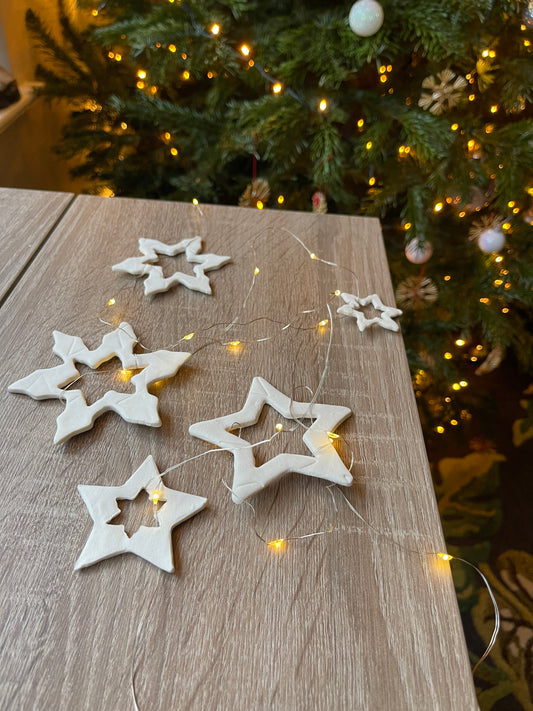 Garland of assorted ceramic porcelain stars with battery powered lights